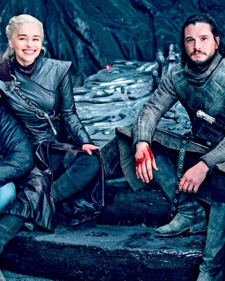 Emilia Clarke (Daenerys Targaryen) et Kit Harington (Jon Snow) pose devant le trône de fer fondu après l’épisode 5 de la saison 8