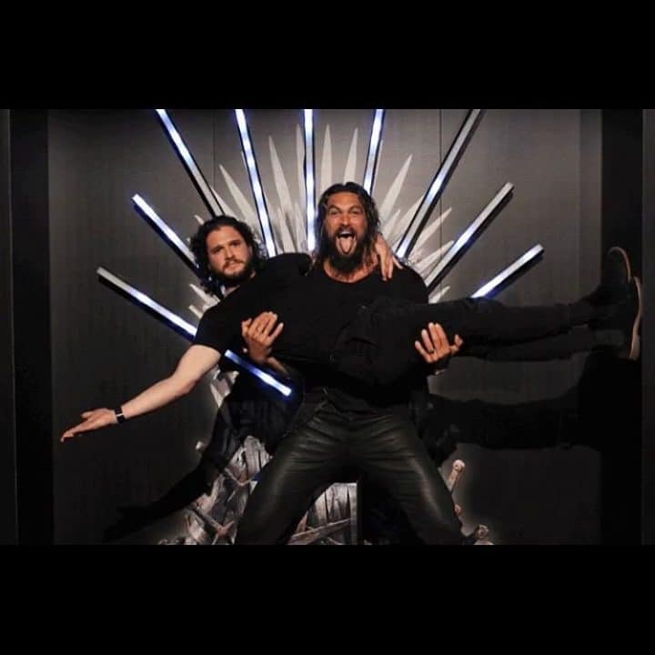 Jason Momoa (Khal Drogo) porte Kit Harrington (Jon Snow) devant une réplique du Trône de fer lors de l’exposition Game of Thrones