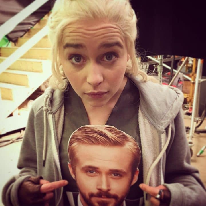 Emilia Clarke (Daenerys Targaryen) et la tête en carton de Ryan Gosling
