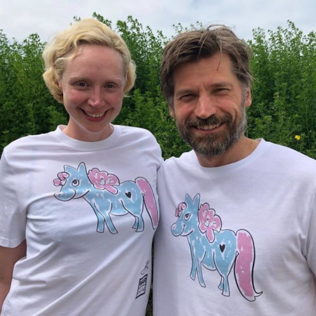 Gwendoline Christie (Brienne de Torth) et Nikolaj Coster-Waldau (Jaime Lannister) avec des t-shirt Licorne en soutien à l’association « Wear it for war child »