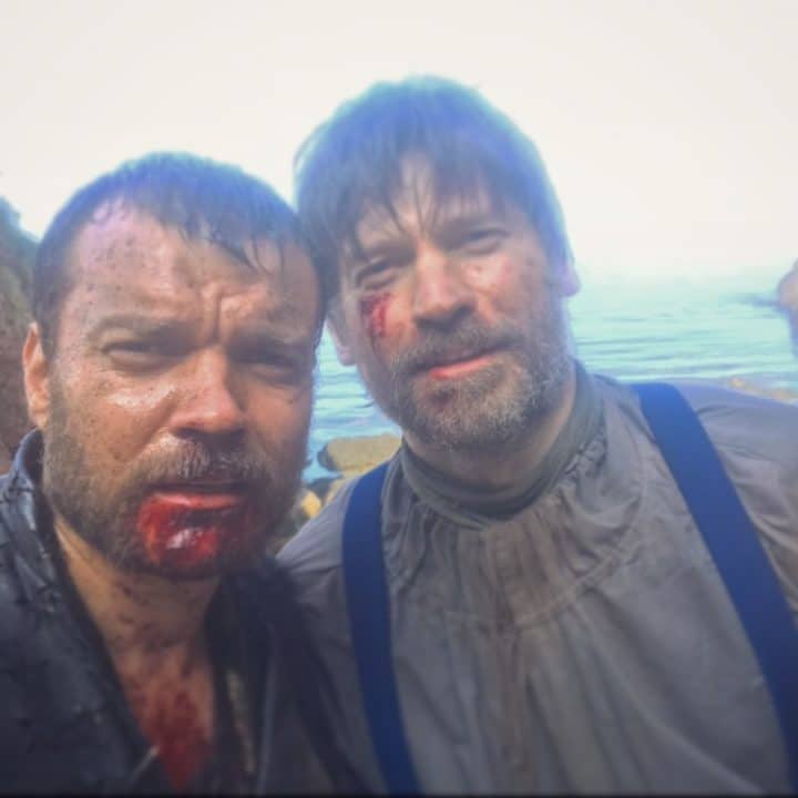 Pilou Asbeck (Euron Greyjoy) et Nikolaj Coster-Waldau (Jaime Lannister) juste après leur bataille lors de l’épisode 5 de la saison 8 de Game of Thrones