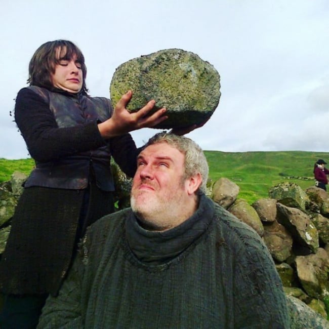 Issac Hempstead-Wright (Bran Stark) et Kristian Nairn (Hodor) s’amusent sur le tournage de la saison 2 de Game of Thrones