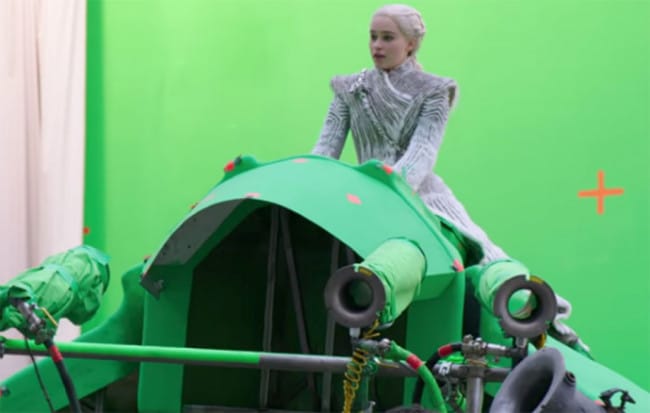 Emilia Clarke (Daenerys Targaryen) installée sur le simulateur de vol pour jouer les scènes ou elle vole à dos de dragons