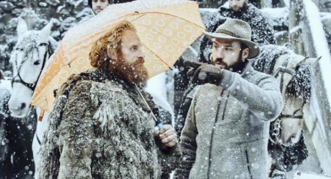 Kristofer Hivju ( Tormund ) et l’un des réalisateur de Game of Thrones en pleine conversation sous la neige