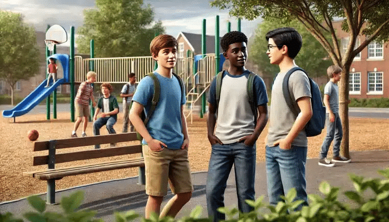 Dans une cour de récréation, trois gamins discutent. Le premier dit ainsi :