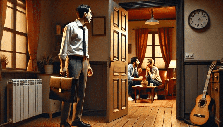 Une femme et son amant sont au lit, après avoir partagé un moment intime. Soudain, la femme entend la voiture de son mari qui rentre au garage. La femme, en plein adultère, s’affole alors :