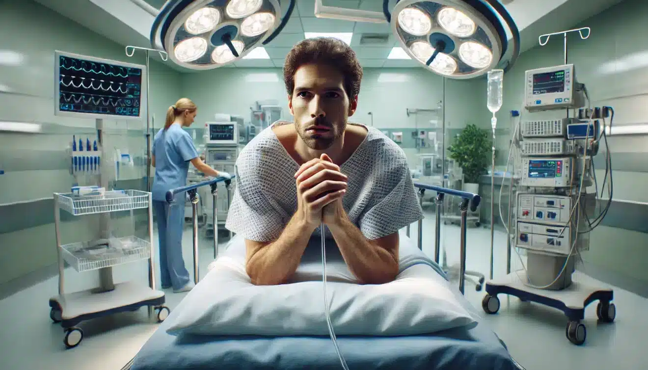 Un gars qui se trouve à l’hôpital pour être opéré d’une hernie est vraiment hyper stressé avant son intervention.