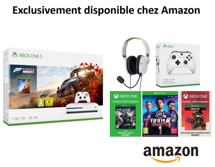 Le pack Xbox One S Forza Horizon 4 + Casque Turtle Beach Recon + Manette Xbox One + Fifa 19 + Token GOW 4 + Token Apex Legends Founders à 230€ au lieu de 500€
