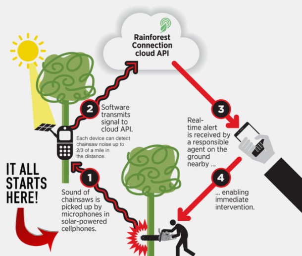 Chaque année, 700 millions des téléphones portables sont jetés. Pour réutiliser ces déchets, l’ONG Rainforest Connection a trouvé le moyen de recycler ces outils pour en faire des micros capables de transférer des messages aux gardes forestiers. Ainsi, lorsque le téléphone entend un bruit, il le transmet aux autorités susceptibles d’intervenir.