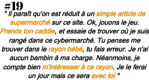 Conclusion du jury TDN : Tout y est pour faire rêver une femme. L’humour, la dénonciation de la société actuelle et l’envie de devenir père. Ça fait rêver, mais ça fait aussi un peu flipper…