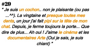 Il a 10 voix dans sa tête, 109 pensées à la seconde, mais il n’arrive pas à s’exprimer correctement. Il se compare à un animal, raconte la fois où il a fait pipi sur son chat, avant d’avouer aimer le cinéma. Il ne semble pas très serein dans sa description ! Ce dernier essaye de détourner son envie de sexe à travers l’humour, mais sans trop effacer ses désirs non plus. C’est un cochon, mais il rigole, mais en fait non. Il ne veut juste pas avouer qu’il en a marre du paquet de mouchoir et des films érotiques. Si vous n’avez pas de chat, vous pouvez toujours tenter…