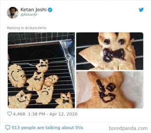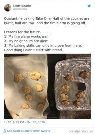 « Cuisine de la quarantaine, essai un. La moitié des cookies sont cramés, les autres sont crus et l’alarme incendie s’est allumé. Leçons pour le futur : mon alarme incendie fonctionne très bien, mes voisins sont alertés et mes compétences en cuisine ne peuvent que s’améliorer. Heureusement, je n’ai pas commencé avec du pain. »
