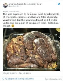 « C’était censé être joli, soigné, un cercle tressé de chocolat, caramel, et pain à la banane et chocolat, mais les tranchées ont éclaté et à la fin cela ressemblait plus à une casserole d’excréments de Big Foot. Mais c’était bon. »