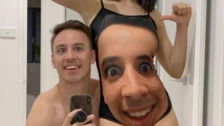 Pedro a donc bandé les yeux de Patty et il lui a demandé d’enfiler le maillot. « C’est quelque chose que tu dois porter alors ferme tes yeux et enfile-le et on fera une révélation fasse au miroir », l’a-t-il prévenue. Quand elle a pu retirer le bandeau de ses yeux et qu’elle a découvert son reflet dans le miroir, elle s’est mise à hurler tellement elle a eu peur. La bonne blague a bien fait rire leurs abonnés sur Instagram. À l’avant du maillot, il y a la tête déformée de son chéri et sur les fesses, elle retrouve également sa bouche entrouverte.