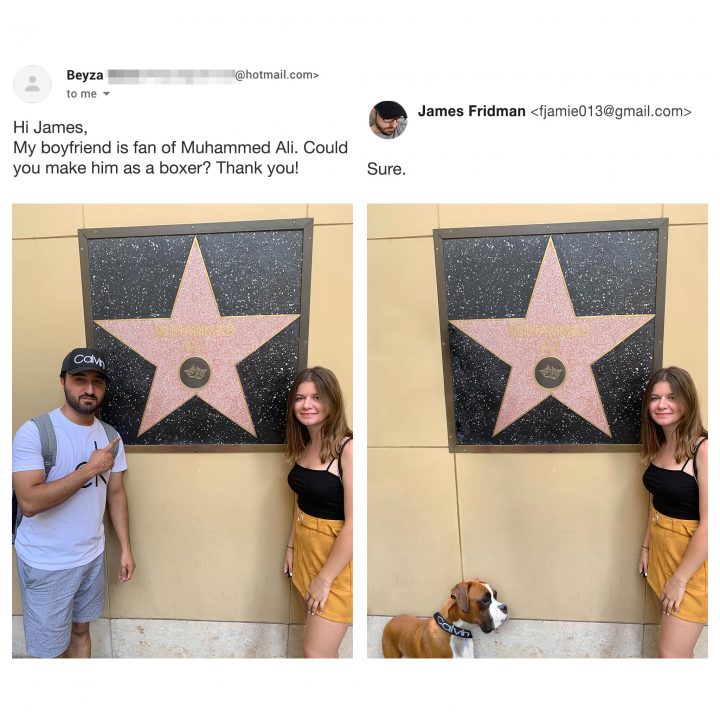 « Salut James, mon copain est fan de Muhammed Ali. Pourrais-tu le faire en boxeur ? Merci. / Bien sûr. »