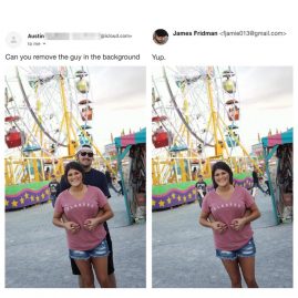 « Peux-tu retirer l’homme en arrière-plan ? / Oui. »