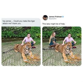 « Salut James, pourrais-tu faire e sorte que le tigre m’attaque ? Merci. / Cette jeune femme a besoin d’aide »