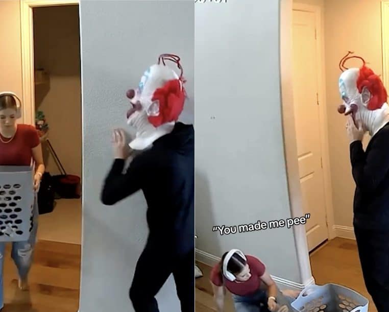Un homme effraie sa femme avec un masque de clown, elle se fait pipi dessus (vidéo)
