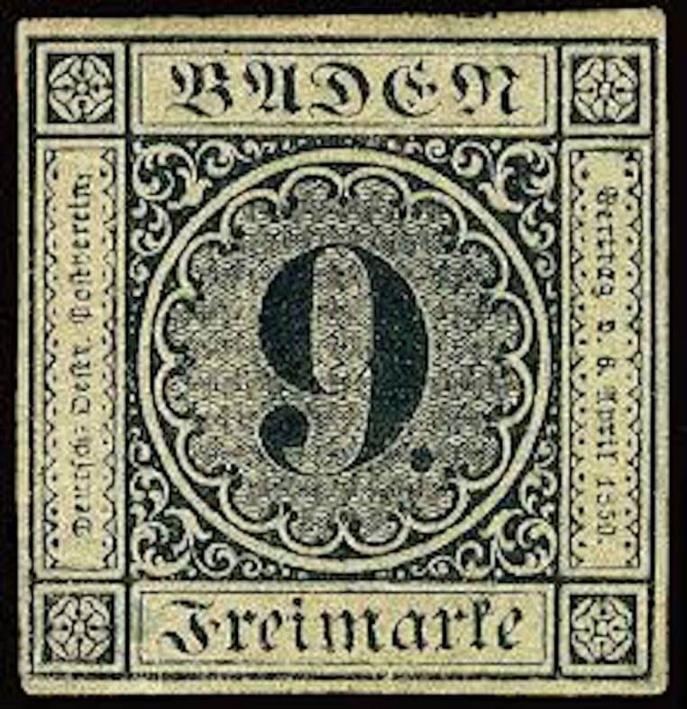 L’erreur Baden 9 Kreuzer est le timbre le plus cher émis par la poste allemande. Seulement quatre exemplaires de cette rareté existent. Comme beaucoup d’autres, ce timbre a une grande valeur suite à une erreur d’impression. Il est de la mauvaise couleur. Ils ont été imprimés en vert (couleur pour les timbres d’une valeur de 6 kreuser) au lieu de rose.