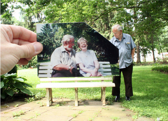 Un homme se remémore le bon temps passé avec sa femme sur ce banc