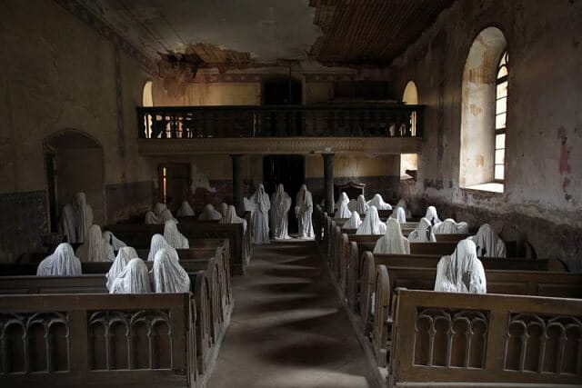 Le toit de cette église s’est effondré en 1968 sur 32 fidèles présents. Depuis elle est abandonnée, mais un artiste a voulu faire revivre ces 32 âmes en plaçant 32 statues sur les bancs, qui sont assez flippantes.