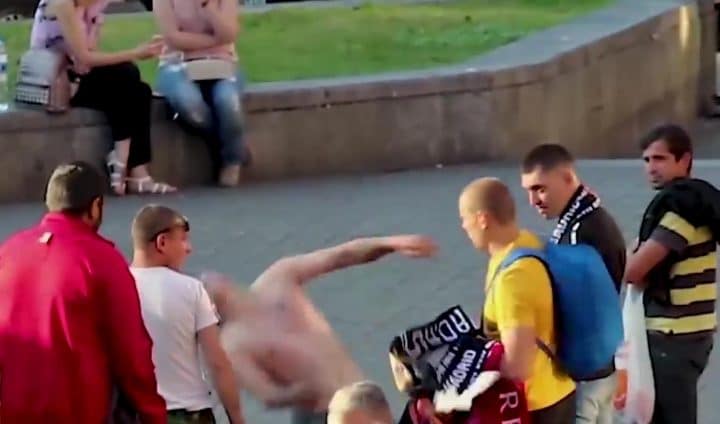 Quand on ne sait pas se battre, alors on s’abstient. Quoi que, ça donne lieu à des vidéos plutôt rigolotes comme celle qu’on s’apprête à vous montrer. On peut voir deux hommes en train de se battre. Ils sont à fond, ils donnent vraiment tout et surtout, ils n’ont pas du boire que de l’eau. Ce moment magique se passe sur la place Bessarabska à Kiev, en Ukraine. On ne sait pas si cette bagarre est réelle ou non. Puis à un moment, l’un des deux pètent un câble et s’en prend à un passant (le mec avec le t-shirt jaune). Ce dernier n’est pas décidé à se laisser faire…