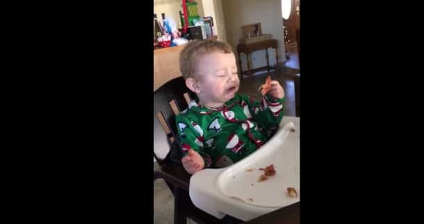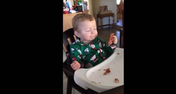 VIDÉO : Ce bébé découvre l’incroyable goût du bacon et sait montrer qu’il adore !