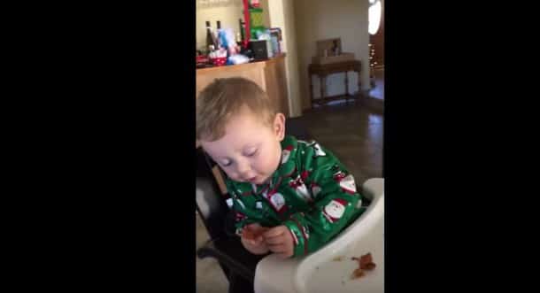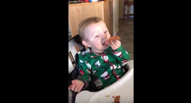 L’éducation au goût commence très tôt nous disent les spécialistes de l’alimentation. En voilà un exemple avec ce petit garçon qui découvre le bacon. En plus, il est facile de constater que le langage continue à s’enrichir puisque Easton, ce jeune gastronome, tente d’assimiler entre quelques mastications le nom de cet aliment nouveau et délicieux.