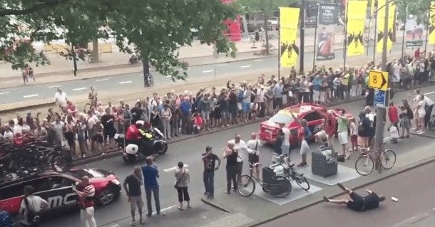 Ce fan du Tour de France est devenu en quelques instants la star du web…le voilà raillé de toutes parts…il faut dire que sa chute est assez mythique ! Lors de l’étape entre Utrecht et la Zélande, un coureur a lancé sa gourde vers la foule pour s’en débarrasser… Un homme s’est alors littéralement jeté sur la gourde pour la récupérer ! Ce Néerlandais a chuté d’une façon spectaculaire… malheureusement pour lui, sa chute aa été capturée… Bon au moins, il a eu la gourde !