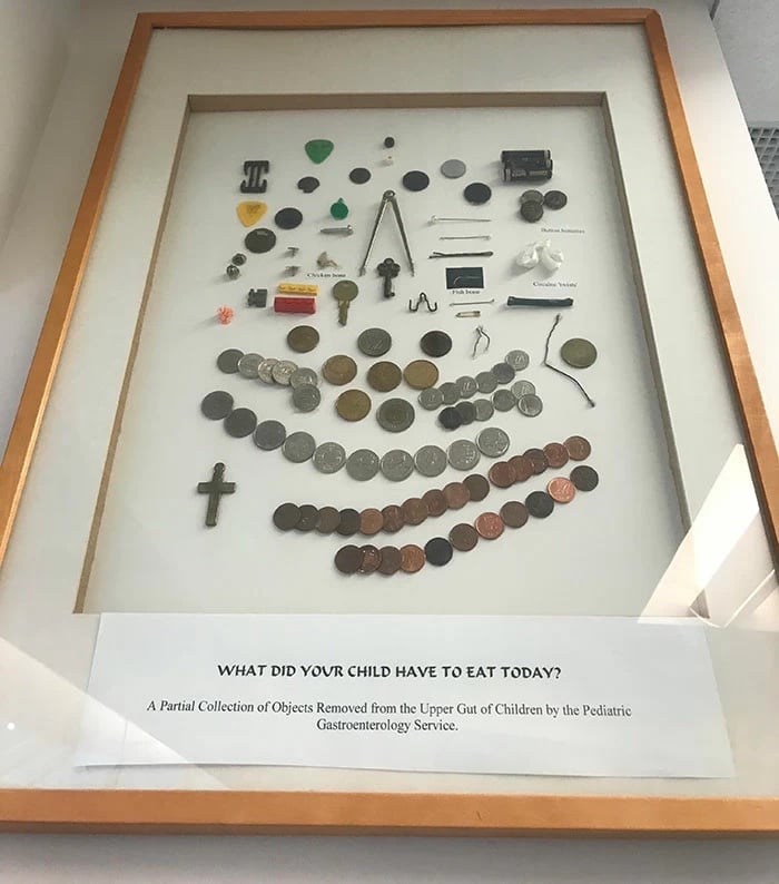 Dans cet hôpital, les membres de l’équipe ont gardé tous les objets ingérés par des enfants du service de gastro-entérologie. Il est précisé que la collection est partielle. En effet, tous les objets ne peuvent pas toujours être récupérés.