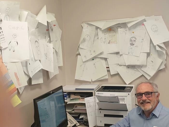 Voilà un médecin qui a le cœur bien sensible. Il a gardé tous les dessins des enfants qu’il a soignés dans son bureau.