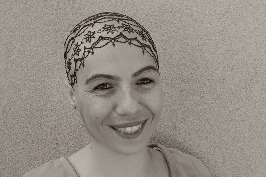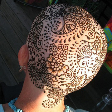 Le henné est utilisé au départ pour décorer le corps, il s’est développé ensuite et permet de réaliser des teintures pour cheveux. Depuis peu on l’utilise pour un nouveau projet. Au Canada, les femmes se font peindre de magnifiques motifs sur la tête afin d’embellir leur cancer et leur vie.