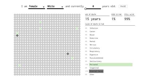 Sur une période de quinze ans, soit de 1999 à 2014, les centres de prévention et de contrôle des maladies aux États-Unis ont rassemblé une grande quantité de chiffres sur lesquels Nathan Yau s’est fondé pour obtenir des données fiables lors de l’utilisation de sa plateforme. Cancers, problèmes respiratoires ou sanguins, troubles osseux ou mentaux, autant de fins possibles pour expliquer notre dernier souffle.