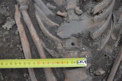 Squelette retrouvé en Pologne avec un trou au niveau de sa colonne vertébrale. Crédit photo : capture d’écran France24