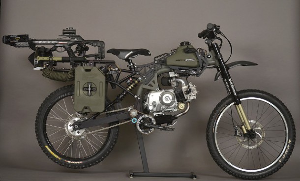 Imaginons que dans un futur plus au moins proches, les créateurs de « The Walking Dead » avaient en fait raison : l’invasion des zombies est imminente ! Il faudrait alors dès à présent parer à cette éventualité afin de ne pas voir l’espèce humaine disparaitre pour laisser place à des zombies sanguinaires prêts à tout écraser sur le chemin et dénués d’âme ! Et bien, sachez que certains ont déjà imaginé ce scénario tragique et anticipent avec la création d’un vélo, le Motoped Survival Bike Black Ops Edition. Ce petit bijou vous permettra d’avoir touts les atouts en main en cas d’invasion de zombies pour survivre un maximum de temps, avec notamment un bidon d’essence, une arbalète, une hache, un réservoir sur mesure, et de nombreux outils comme des cordes ! Un vélo que n’aurait pas certainement renié Rick Grimes (le personnage principal de « The Walking Dead ») dans sa lutte éternelle avec les zombies, c’est sur ! Avec un vélo pareil, vous avez toutes les cartes en main pour planifier votre survie..