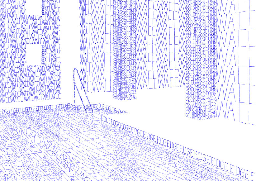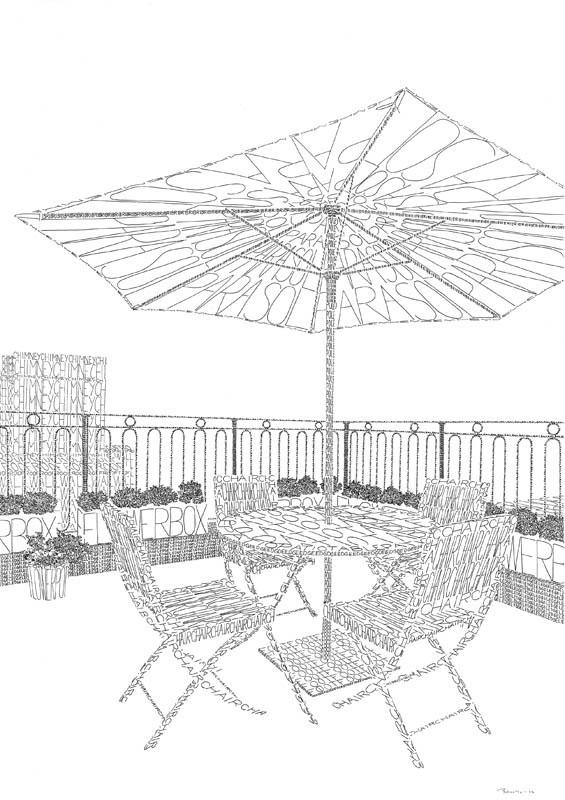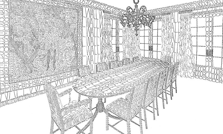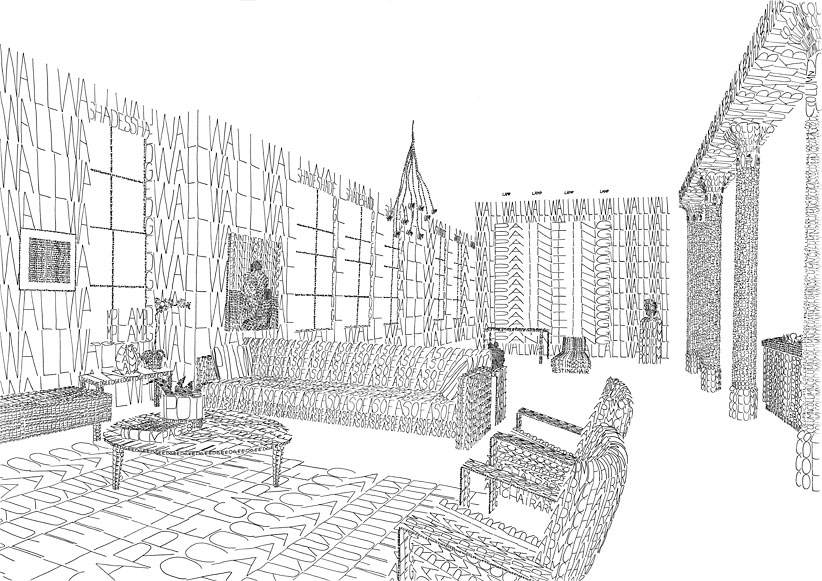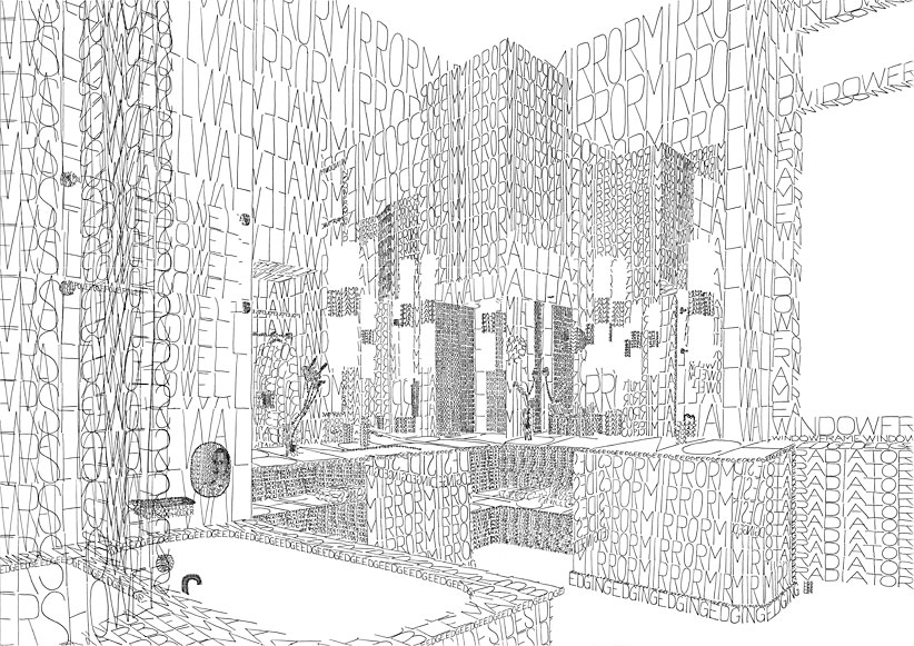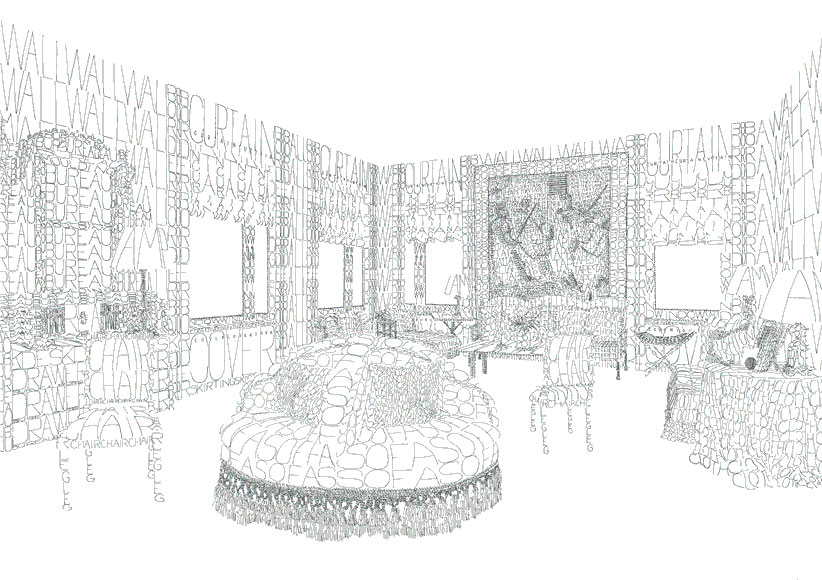 Dans un jeu de typographie et de formes, les mots viennent créer le mobilier, le décor tout l’intérieur et même les murs et les fenêtres.