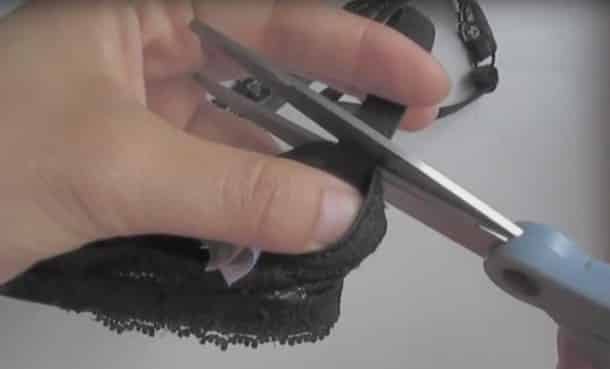 Coupez soigneusement la partie élastiquée avec l’attache se fermant au dos. Coupez aussi le bout des bretelles rattachées à cette partie élastiquée. Avec une épingle à tête, fixez provisoirement les bouts des bretelles au bas des bonnets.