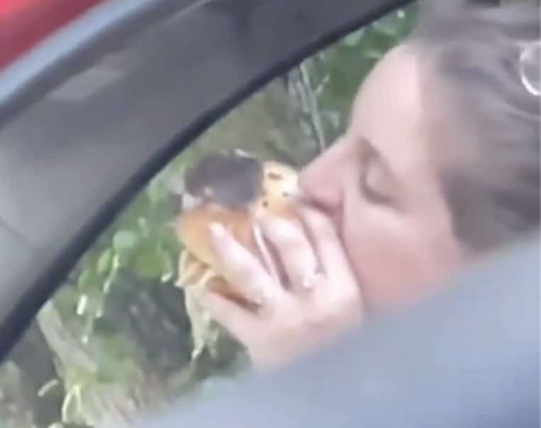La jeune femme, assise au volant, profite de son repas en toute décontraction. Elle porte des morceaux du burger à sa bouche, tandis que la petite souris explore l’autre extrémité du sandwich. Puis, elle fait tourner l’aliment pour regarder le petit rongeur dans les yeux et lui donner un petit bisou.