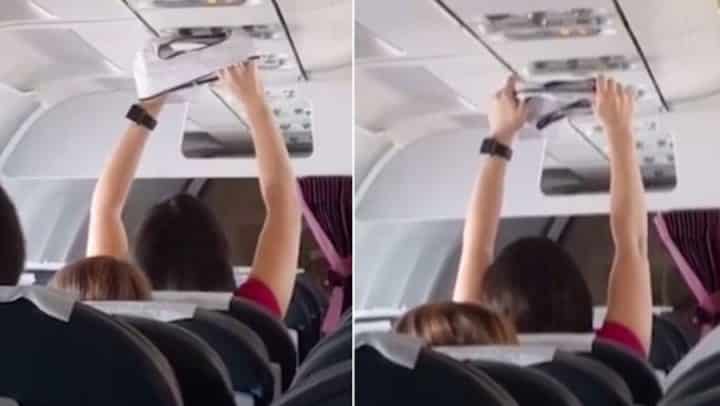 Mais qu’est-ce qu’il se passe dans la tête de certains ? Une passagère sans gêne a été aperçue en train de sécher ses sous-vêtements, devant tout le monde, dans l’avion. Elle tend ses petites culottes humides vers les bouches d’aération au plafond. Regardez dans la vidéo comment elle sèche son linge sale en public…