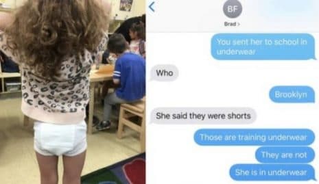 Traduction : « – Tu l’as emmené à l’école en sous-vêtements » – « Qui ? » – « Brooklyn » – « Elle m’a dit que c’était un short » – « C’est un sous-vêtements de sport, et non un short. Elle est en sous-vêtements ! »