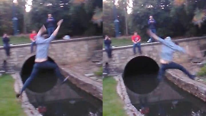 Il prend de l’élan, titube un peu et se rend compte que ce simple saut ne sera pas si facile que ça. « Tu vas sauter au-dessus de ça », lui demande un ami qui le filme. « Oui », répond-il sûr de lui. Mais ses amis gloussent déjà, comprenant que les choses risquent de mal tourner. « Je ne me sens pas tout à fait prêt », finit-il par dire dans un élan de lucidité. « Je ne sais pas si je peux le faire. Prenez mon portefeuille et tout mon bordel ». Il saute et évidemment… il rate son coup. Il atterrit une jambe dans l’eau, l’autre sur le rive d’en face, avec l’entrejambe qui vient taper le muret. Figé par la douleur, il tombe dans l’eau alors que ses amis sont hilares. Quand l’ami qui filme se rapproche de lui, il est déjà sorti de l’eau et continue à se tortiller de douleur par terre.
