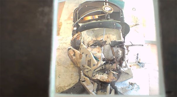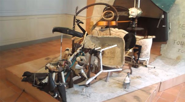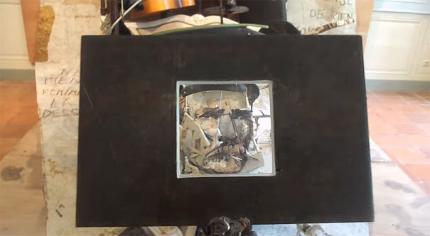 L’artiste français Bernard Pras, a utilisé un empilement de déchets, et de meubles judicieusement disposés, qui selon une perspective donne l’illusion d’optique de représenter le portrait du facteur.