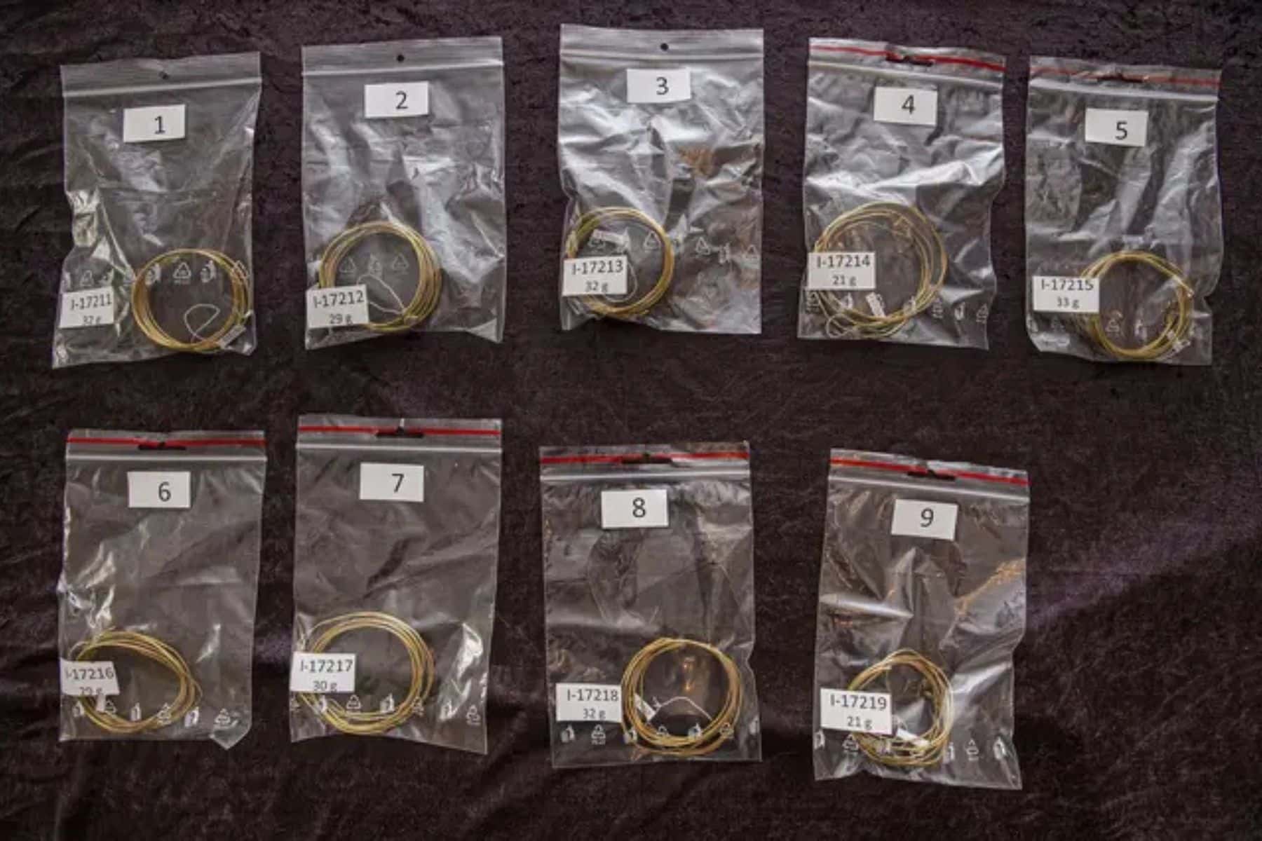Les spirales présentent un joint de soudure, montrant que les fils étaient fabriqués à partir de fines feuilles martelées puis enroulées. Un fil est même creux. La plupart des spirales étant intactes et non utilisées, elles ont probablement été cachées peu de temps après leur fabrication.