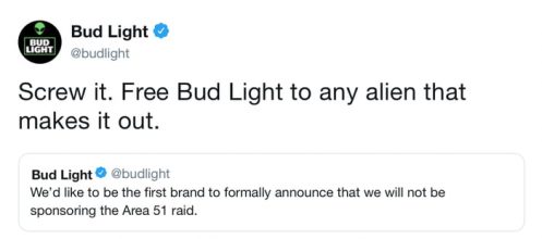La marque de bière Bud Light a annoncé qu’elle créera une canette de bière commémorative de la zone 51 pour les Aliens s’il arrivent à obtenir 51 000 retweets sur Twitter.