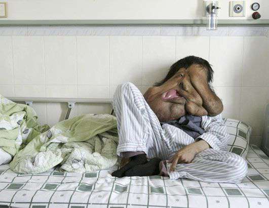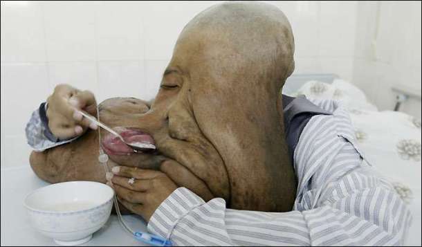 Cet homme de 30 ans avait sur le visage une tumeur de pas moins de 25 kilos qui le défigurait totalement, d’où son surnom d’Elephant Man. Cette imposante tumeur s’étendait de son torse à son front et l’empêchait de dormir, de se nourir et de vivre comme tout le monde ! Cette tumeur est le résultat idiot d’une petite boule sur son visage qu’il a détecté lorsqu’il était enfant. Faute de moyens, ses parents n’ont pas pu l’emmener consulter et des années plus tard, la tumeur a pris une ampleur considérable… Après 4 interventions, les chirurgiens ont réussi à atténuer la souffrance de ce chinois Huang Chuncai âgé aujourd’hui de 37 ans. Des traces de tumeur persistent et persisteront toujours ! En revanche, 21 kilos de cette tumeur ont pu être retirés à celui que le monde appelait Elephant Man. Grâce à ces interventions, il espère retrouver rapidement une vie normale, pouvoir travailler pour gagner sa vie grâce à son apparence qu’il juge lui même moins repoussante !
