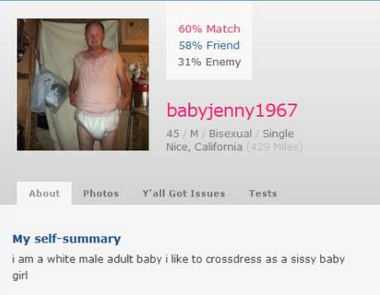 Traduction : « Je suis un gros bébé blanc qui aime se déguiser en bébé fille«