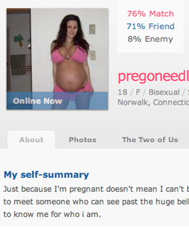 Traduction : « Juste parce que je suis enceinte comme une grosse cloche, cela ne signifie pas que je ne peux rencontrer quelqu’un qui pourra me voir pour ce que je suis vraiment«
