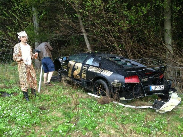 Pendant la course Gumball 300, on conduit costumé comme le prouve la tenue du pilote. Ce qui n’empêche rien l’accident estimé à 380 000 euros.