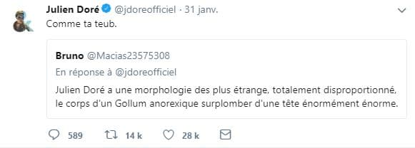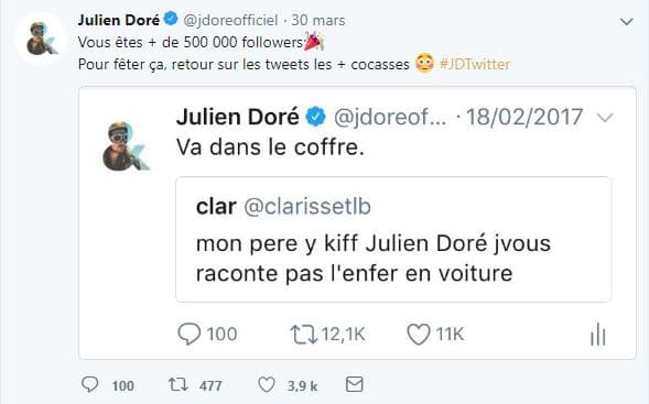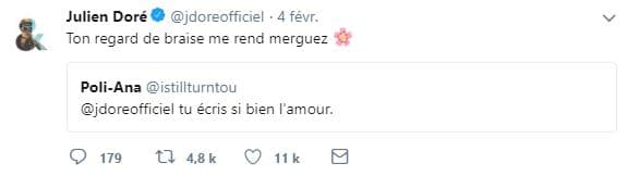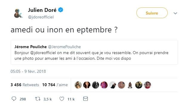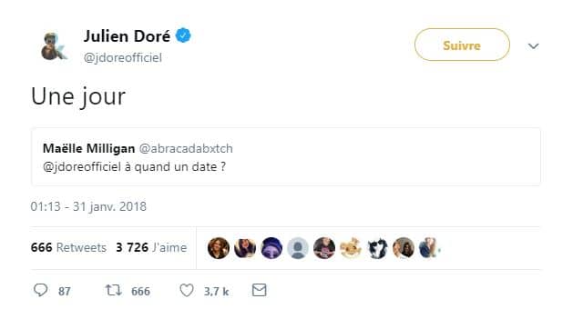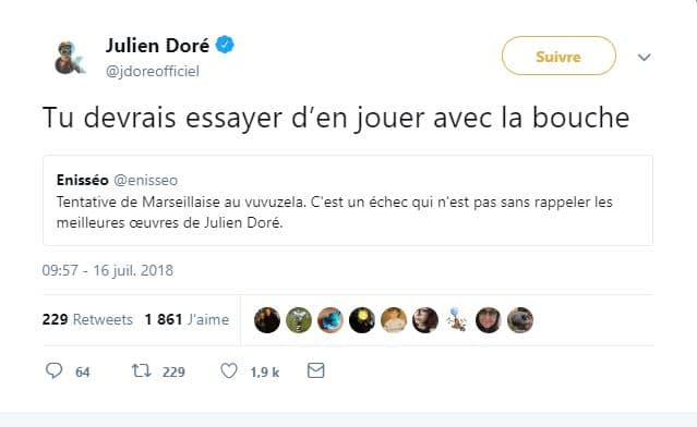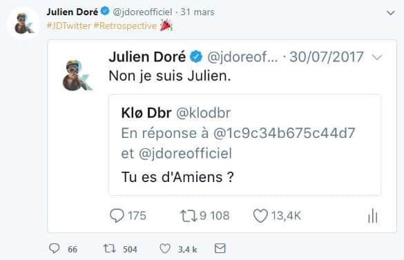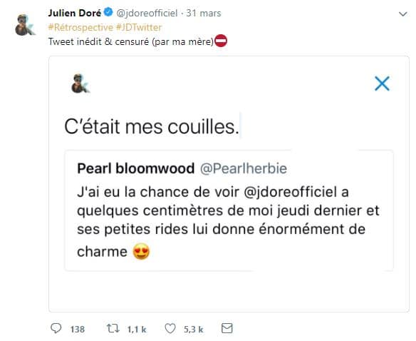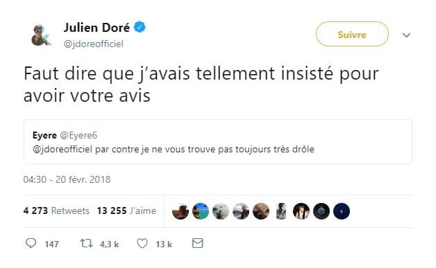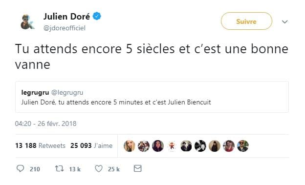 En plus du succès de son dernier album, Julien Doré se distingue des autres stars françaises par son humour sans limite sur Twitter. Bien sûr, il aura toujours des détracteurs qui n’apprécieront surement pas ses petites blagues mais il a au moins le mérite de se démarquer de tout le monde et de nous régaler.