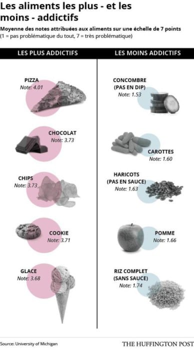 Afin de les définir, les sondés ont utilisé l’échelle d’addiction alimentaire de Yale, et relevaient les nombres de fois où, pour un aliment particulier, ils se sont reconnus dans des phrases comme « Je mange jusqu’à m’en rendre malade ». Le Docteur a ensuite fait le score des aliments désignés et a analysé le comportement engendré.